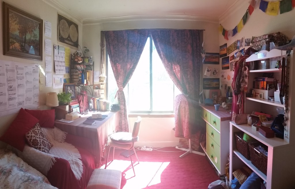 不過我當初決定租這裡,並非因為Vintage 文青風格,而是我所租住的房間,完全是我當時內心的Dream Room! 由於非常非常喜歡電影《天使愛美麗》及其暗紅色調的房間,同時又熱衷西藏文化,而這小房間,不單是暗紅色調,還有望窗的書桌,房間裡掛著一條經幡以及有禪修用的坐墊,難怪一見鍾情。然而我之所以說Sublet是為未來家居作風格練習,正正因為當我住進夢寐以求《天使愛美麗》的房間後,發現原來這並非我理想的居住環境,暗紅色調太過壓迫、心情會受影響,我也融入不了文青們每周末在車房彈結他唱歌飲酒的活動。