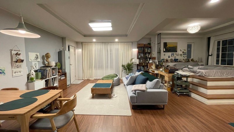 在看《無法抗拒的他》時,特別留意到娜比的家。開放式studio,四四正正分成三個區域:放了灰色布藝梳化的客廳區、開放或廚房連小餐桌區,以及用三級樓梯做隔格、放了地台床及工作桌的房間區。沒有電視、大衣櫃等常見家品,卻有許多佈置巧思,例如懷舊唱碟機、許多矮櫃、書架,還有貼在牆上韓素熙的畫作,完全就是藝術家家居的模樣。