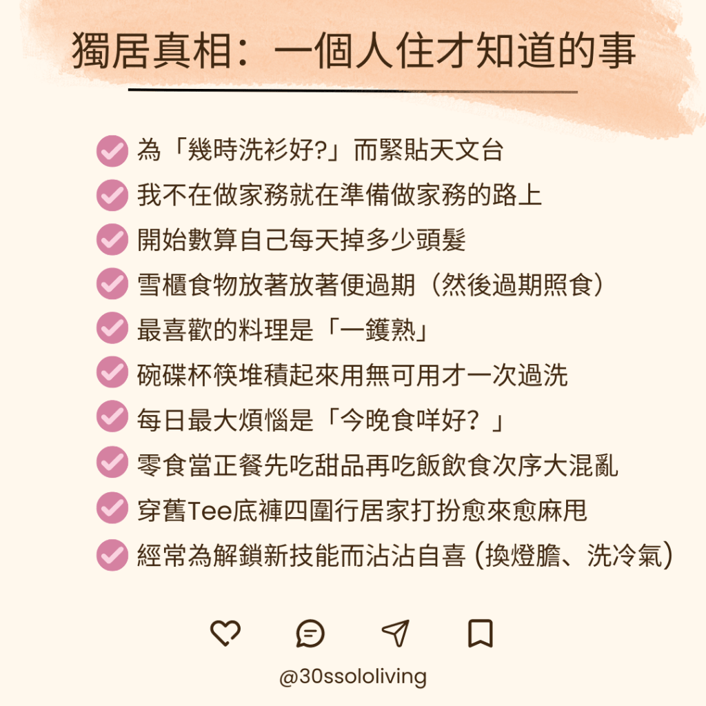 發現身邊愈來愈多男生女生獨居,一個人住有許多美好事情,譬如私人空間與自由,但也有許多獨居後才發現的真相。這次想和大家分享一些獨居真相,一些你可能不知道,但一個人住超有共鳴的事: